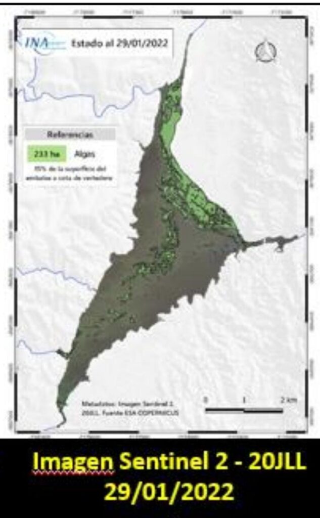 La imagen satelital de Sentinel 2 del 29 de enero de 2022, mostraba un afloramiento de cianobacterias que ocupaba 230 hectáreas de superficie en el lago San Roque.