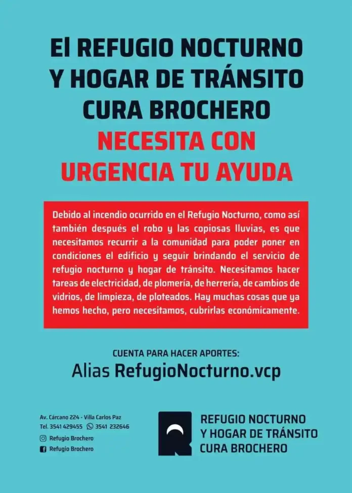 El Refugio Nocturno y Hogar de Tránsito Cura Brochero de Villa Carlos Paz inició una campaña solidaria para reunir fondos que le permitan poner en condiciones su sede de avenida Cárcano 224, luego de atravesar en pocas semanas un incendio, un robo y los daños provocados por las copiosas lluvias recientes.