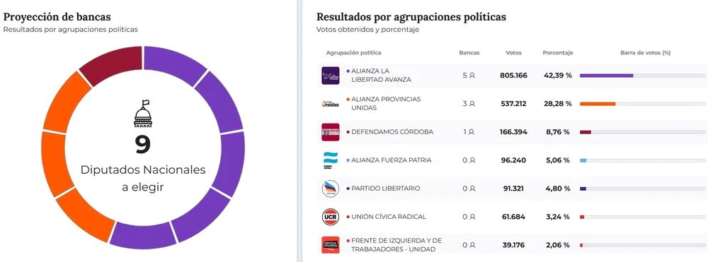 La elección marca un cambio significativo en la composición cordobesa de la Cámara de Diputados, con la mayoría de bancas para La Libertad Avanza, una presencia fuerte de Provincias Unidas y una representación para Defendamos Córdoba.