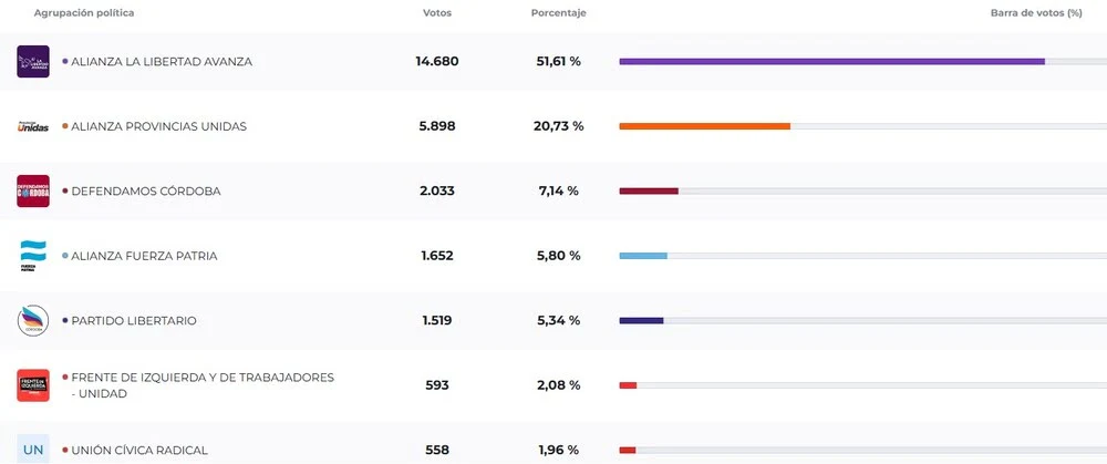 Los datos locales confirman una fuerte adhesión al espacio que lidera el presidente Javier Milei en el distrito, mientras que el cordobesismo mantiene presencia con un segundo lugar firme.