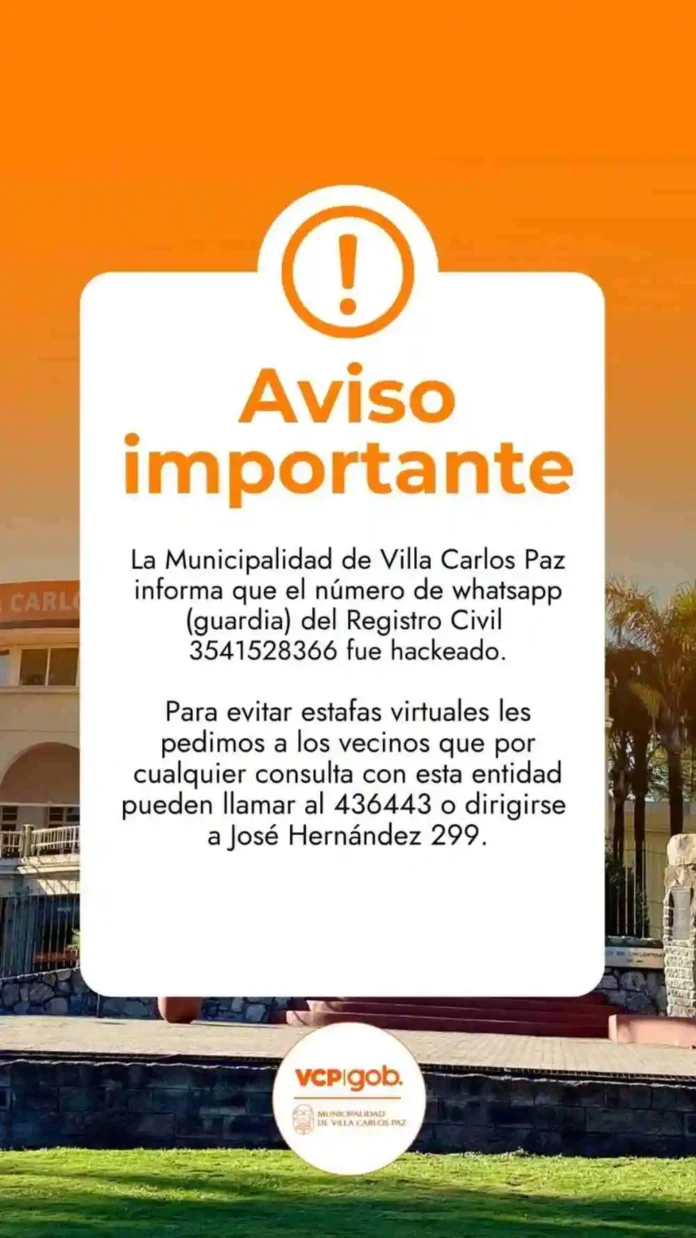 La Municipalidad de Villa Carlos Paz informó que el número de WhatsApp del Registro Civil (guardia) —3541 528366— fue hackeado, por lo que se recomienda no responder mensajes ni brindar datos personales a través de ese contacto.