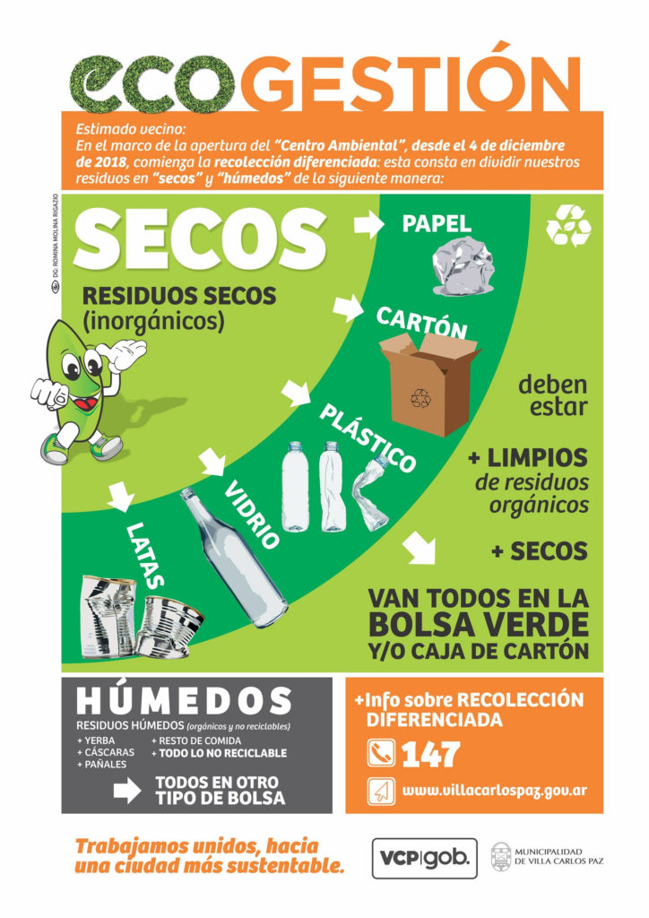El municipio de Villa Carlos Paz informó que a partir del martes 4 de diciembre comenzará la recolección diferenciada de basura que requerirá dividir los residuos en secos (papeles, cartones, plásticos, vidrios, latas) que irán en una bolsa verde o caja de cartón; y en húmedos (yerba, cáscara, pañales, resto de comida, y todo lo no reciclable) que irán en cualquier otro tipo de bolsa.