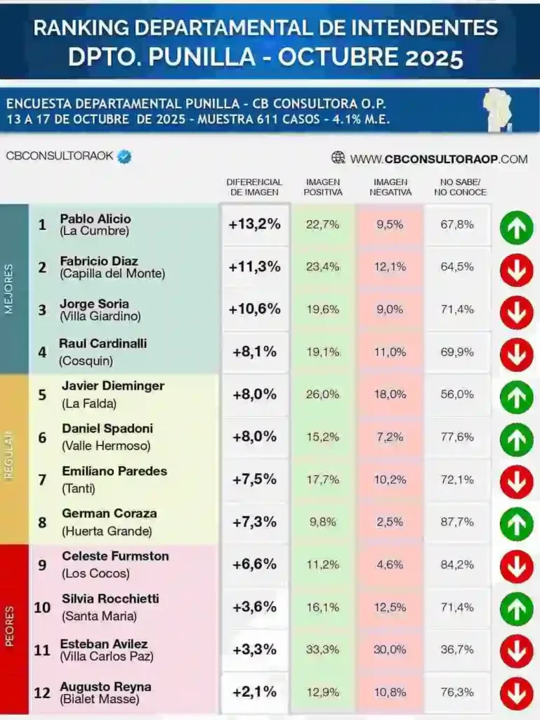 En Punilla, nuevamente el mejor posicionado fue Pablo Alicio, intendente de La Cumbre, mientras que Esteban Avilés, jefe municipal de Villa Carlos Paz, se ubicó en el penúltimo lugar entre los 12 mandatarios evaluados.
